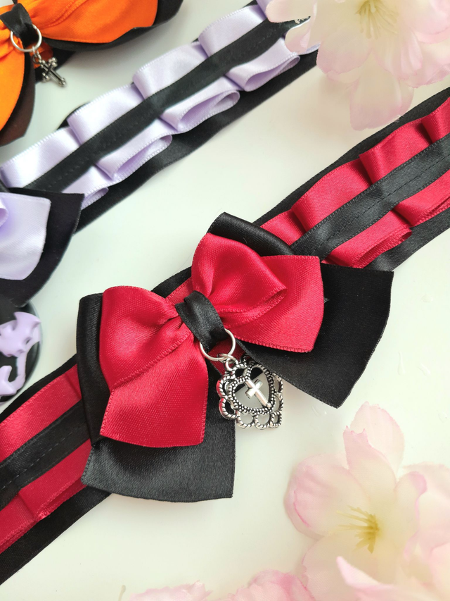 Kaulan taakse nauhalla sidottava choker-kaulakoru. Ommeltu pehmeästä satiininauhasta.