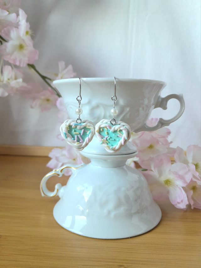 Kakkukorvakorujen uusi malli! Uudessa mallissa pursotukset korostuvat ja tulevät näkyville paremmin eri kerroksissa. Uutenä lisäyksenä myös "strösselit" kakkujen päällä. Muotoilu on tehty käsin ja sydämen muoto on leikattu ääriviivamuotilla. Kakut on viimeistelty lakkapinnalla. B-laatuisessa parissa toisen kakun takaosan massaan on jäänyt hyvin pieni kolo.