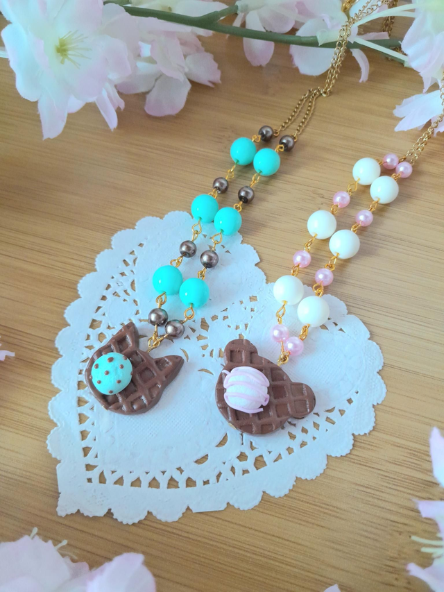 Kaulakorujen vohveliriipukset ja niiden yksityiskohdat on muotoiltu käsin. Pinta on viimeistelty lakalla. Kaulakorun pituus noin 30 cm.
