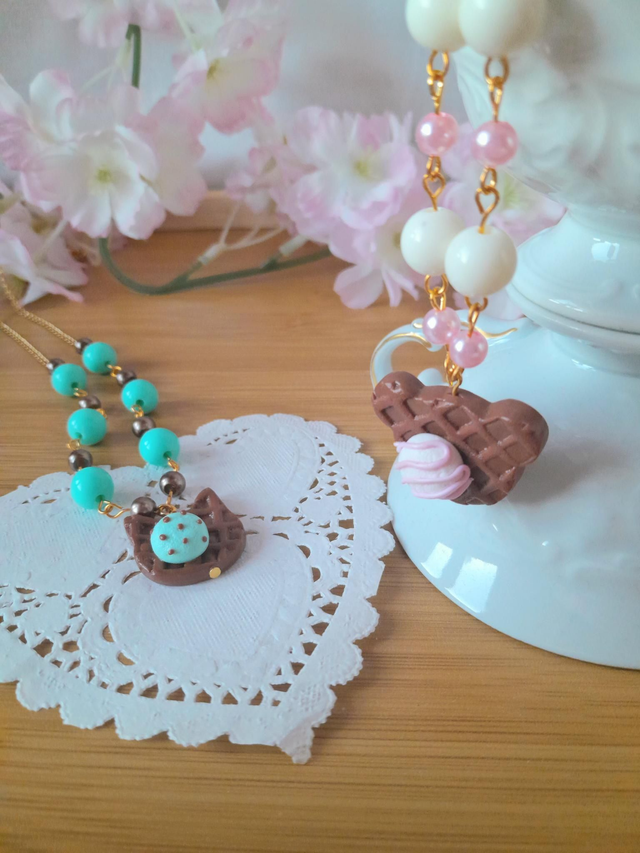 Suloiset eläinvohveli kaulakorut muodoissa nalle ja kissa. Molempia kaulakoruja saatavilla vain yksi kappale.