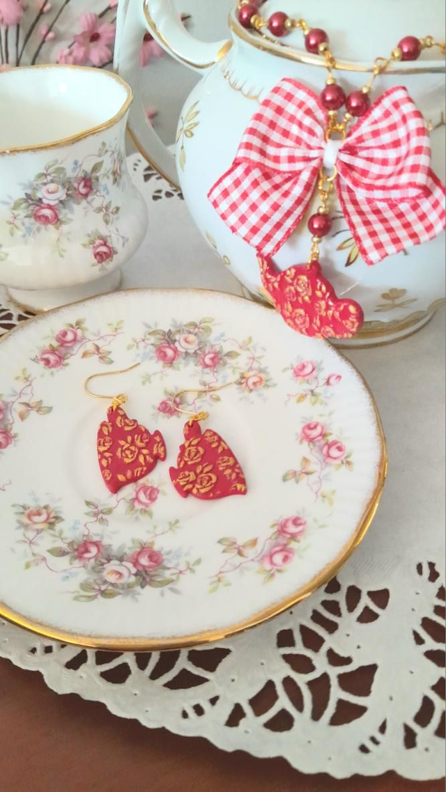 Nämä uniikit korut ovat valmistettu polymeerimassasta sekä ruusukuvioinnissa on käytetty apuna kuviorullaa. Viimeisenä silauksena ruusut ovat käsinmaalattu akryylimaalilla ja pinta on viimeistelty lakkapinnalla. Saatavilla myös kaulakoruna!